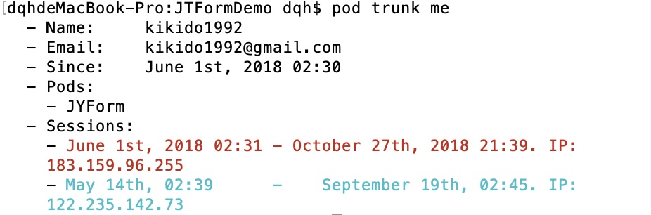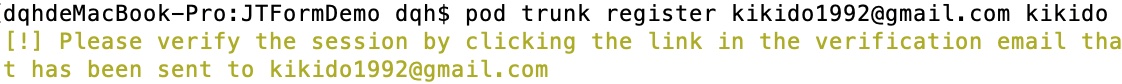 当你运行pod trunk me后,发现不是如上图的结果,那么你可能需要重新登陆或者注册,也就是运行如下的命令pod trunk register [EMAIL] [USERNAME],运行成功之后,你填的邮箱会收到一封邮件,点进去点击里面的链接就算是登录成功了。