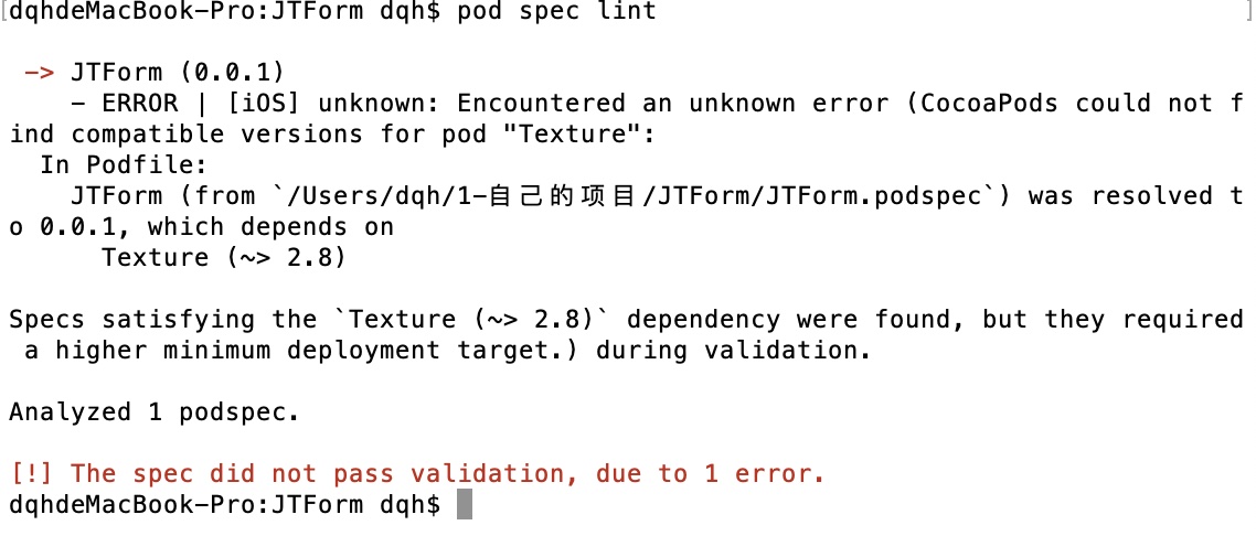 验证你编辑的podspec文件是否符合规范,如果出现error的话是不可以的,warning的话是可以的,可以使用命令pod spec lint --allow-warnings来忽略所有warnings。