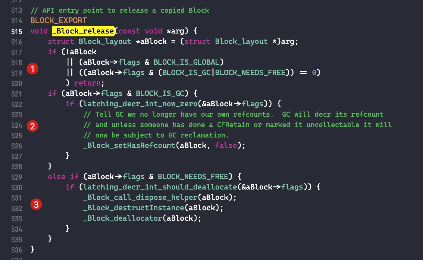 - 判断条件 3:如果 block 已经在堆上了,则将其引用计数减 1,如果减为 0,则调用下面三个函数