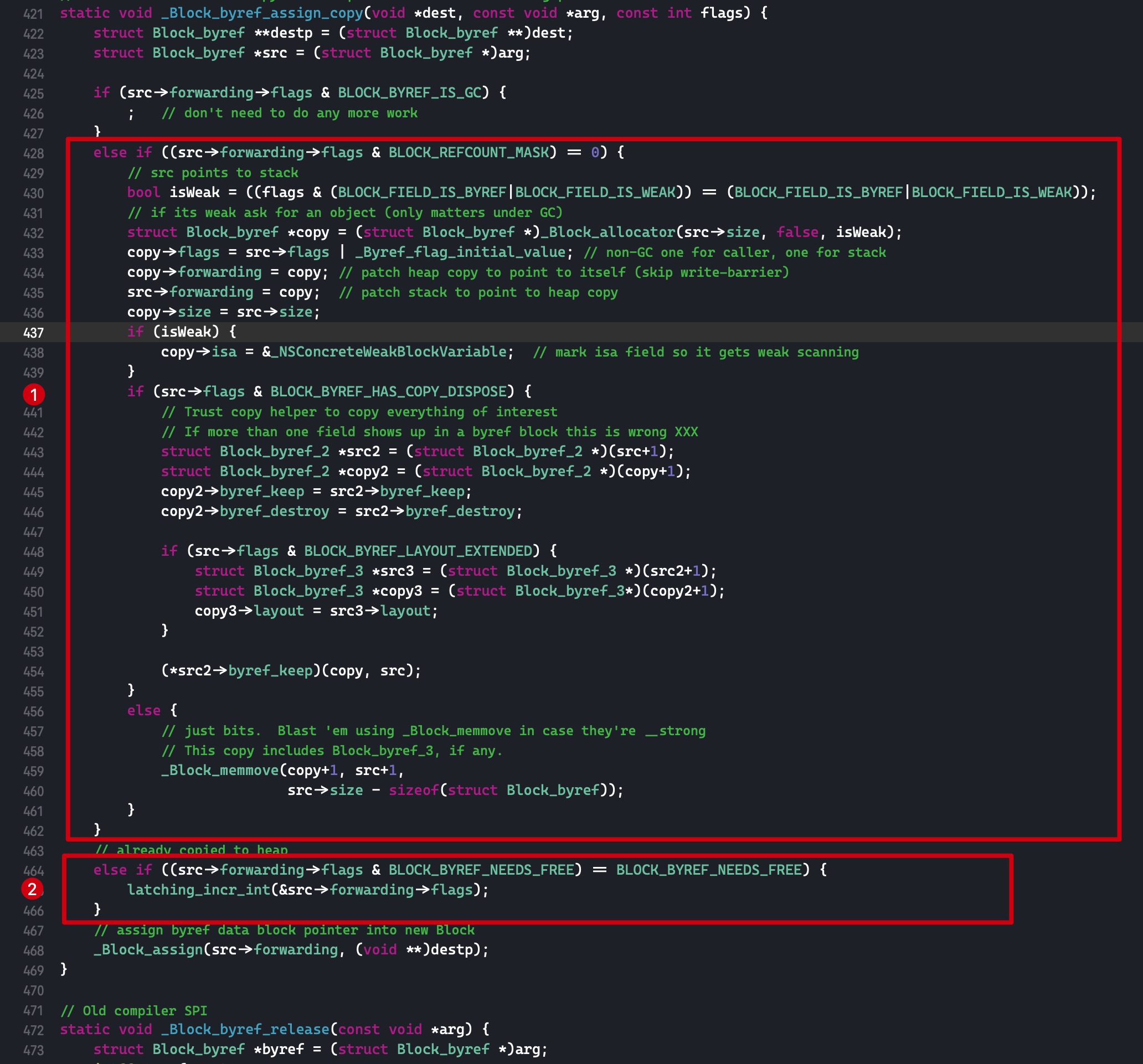 _Block_byref_assign_copy 实现中代码块 2 的作用是如果 Block_byref 持有的变量已经拷贝到堆中了, 则增加其引用计数