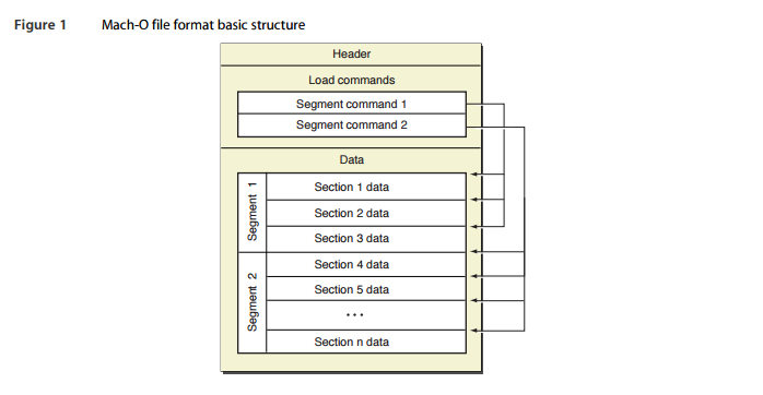 每个 Mach-O 文件包括一个 Mach-O Header,然后是一系列的载入命令 load commands,再是一个或多个段(segment),每个段包括0到255个节(section)。Mach-O使用REL再定位格式控制对符号的引用。Mach-O在两级命名空间中将每个符号编码成“对象-符号名”对(所以需要保持 selector 的唯一),在查找符号时则采用线性搜索法。