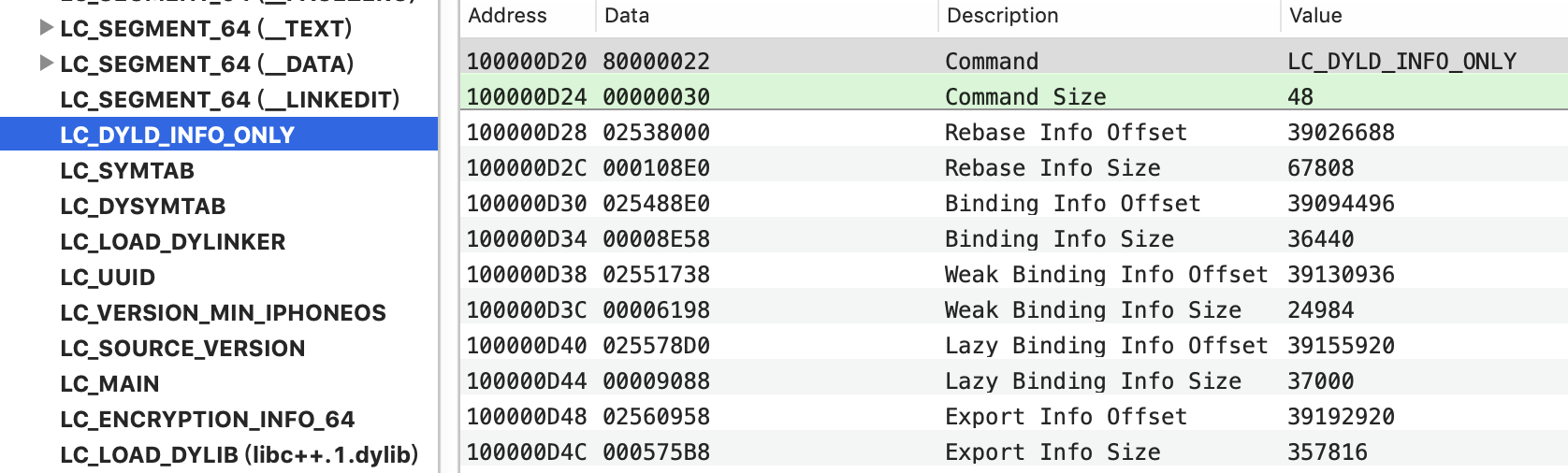 在 mach-o 的一个载入命令LC_DYLD_INFO_ONLY可以查看到rebase, bind, week_bind,lazy_bind的偏移量和大小。