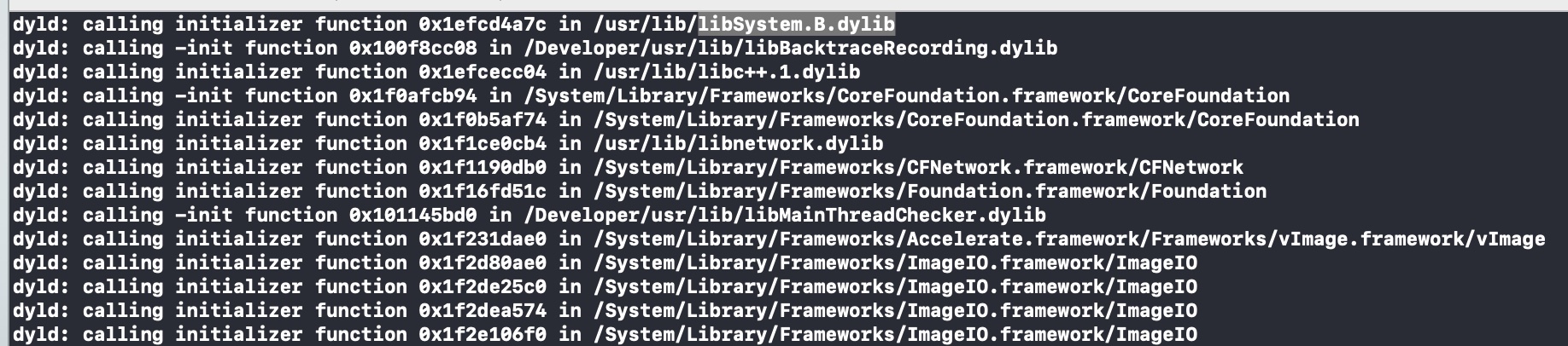 每一个dylib都有自己的初始化方法,当相应的 image 被加载到内存后,就会调用初始化方法。当然这不是调用名为initialize方法,而是C++静态对象初始化构造器,__attribute__((constructor))标记的方法以及Initializer方法。你可以在程序中设置环境变量DYLD_PRINT_INITIALIZERS来打印dylib的初始化方法。