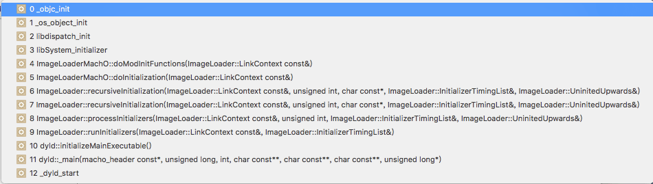 添加一个符号断点_objc_init,下面是方法调用栈: