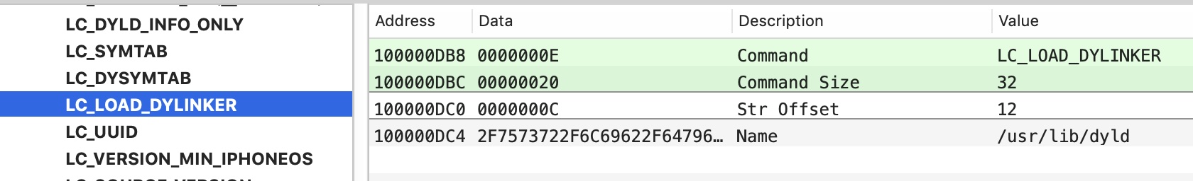 | LC_LOAD_DYLINKER | 启动动态加载连接器/usr/lib/dyld程序 |