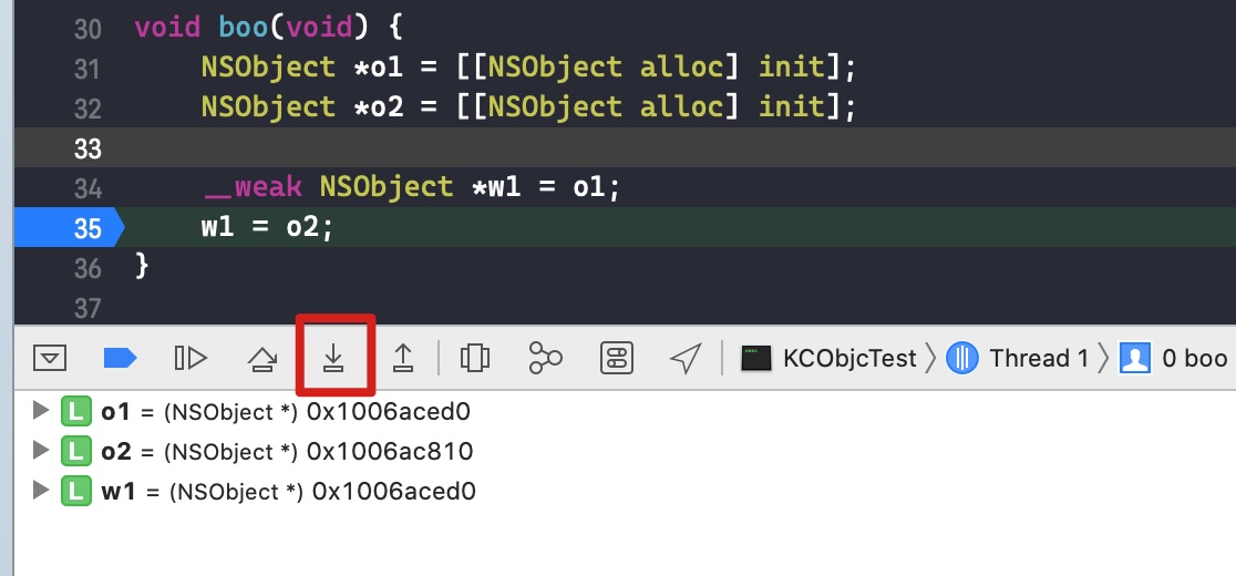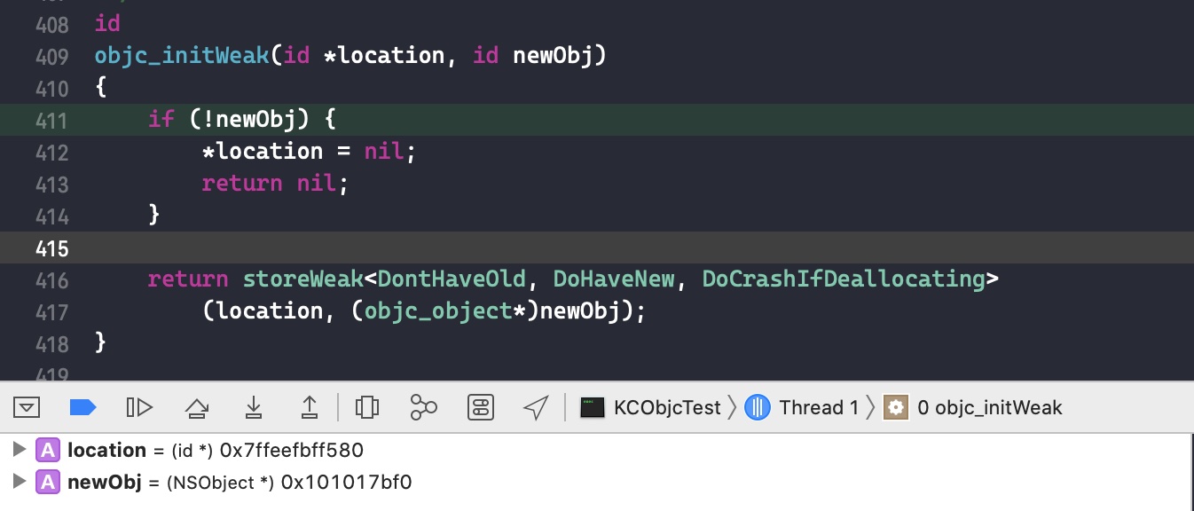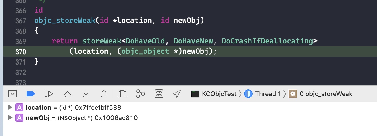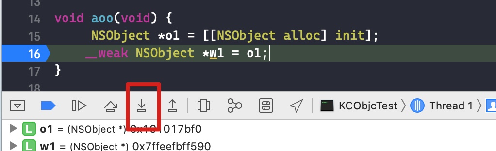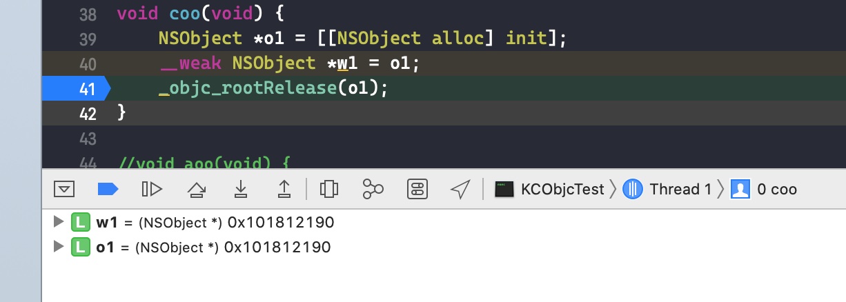 弱引用者如何注册到弱引用表 首先我们研究弱引用者是如何注册到弱引用表中的 调试代码如下(代码需要在开头提到的可编译版本里面才能运行, 后面不再解释), 注意里面打了个断点, 运行程序