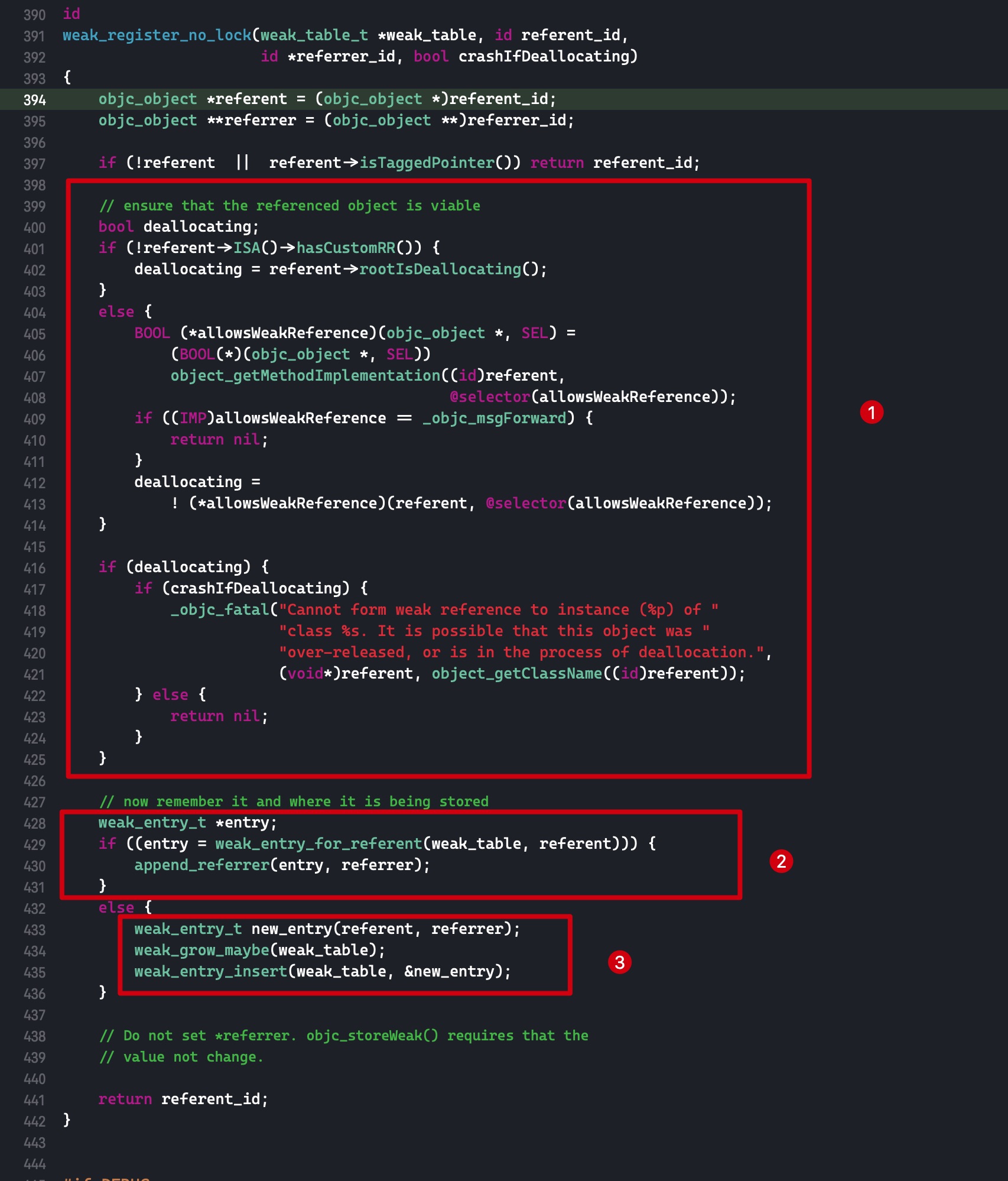 对象被弱引用者引用了, 则修改对象 isa 指针上位域的信息, 将weakly_referenced置为 YES, 表示该对象被一个弱引用者引用.