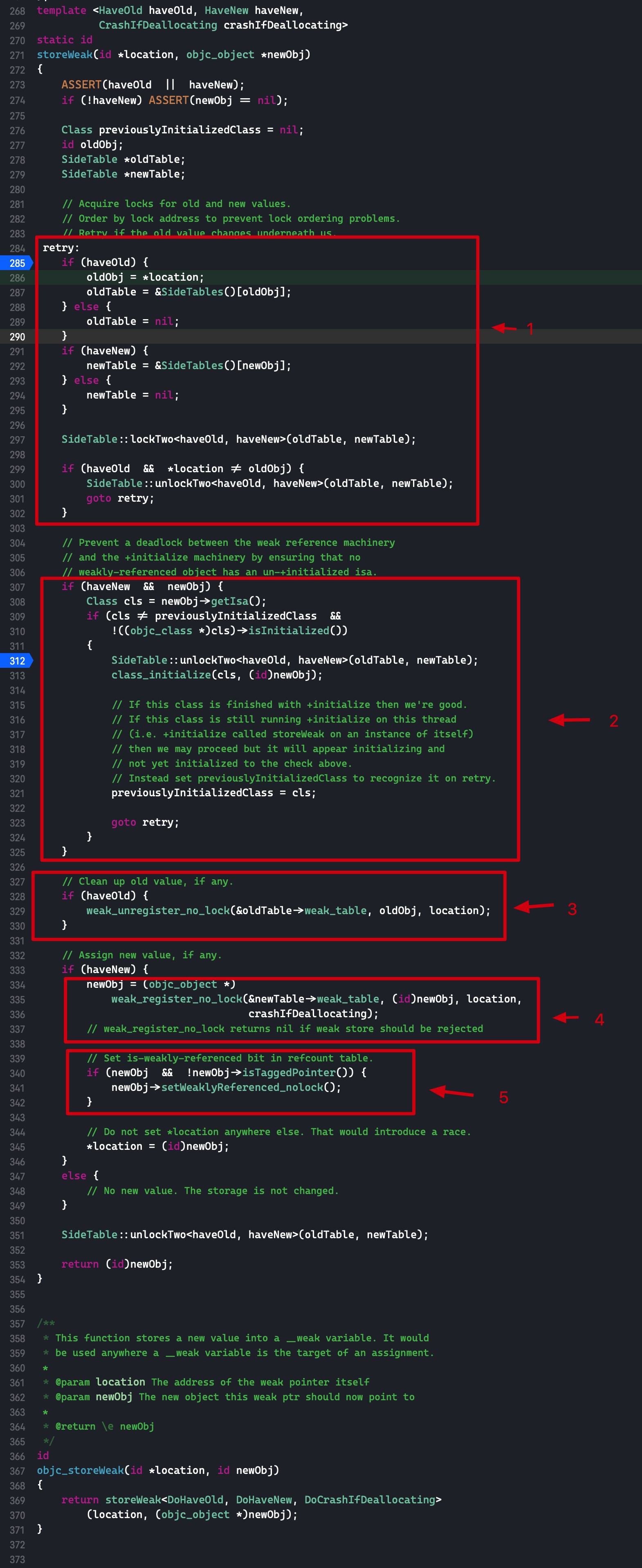 这个函数的作用是初始化弱引用者. 需要注意的是storeWeak模板里面的两个参数 DontHaveOld, DoHaveNew. 它们分别是HaveOld和HaveNew枚举的变量. 枚举里面变量的含义如下