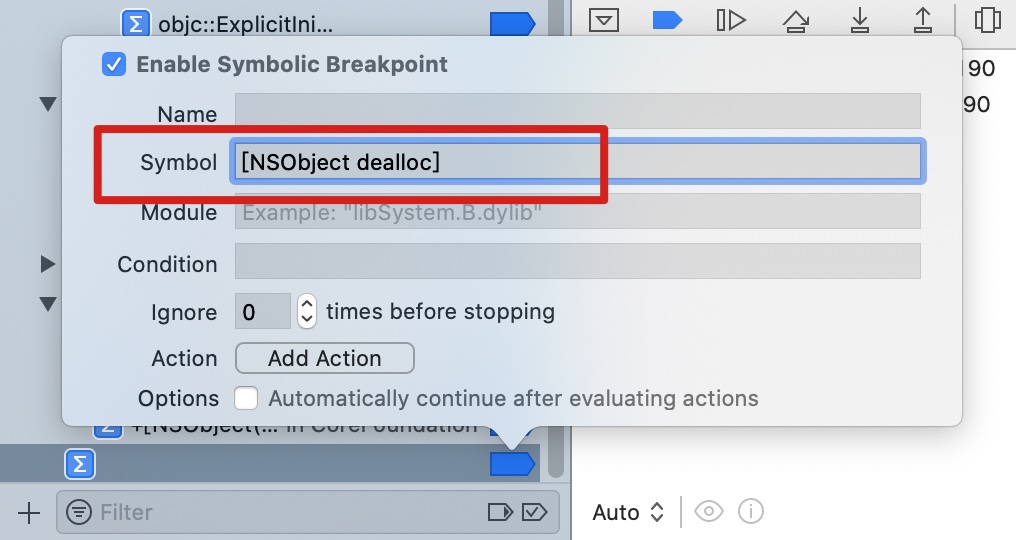 添加一个symbolic breakpoint, 在symbol里面输入[NSObject dealloc]
