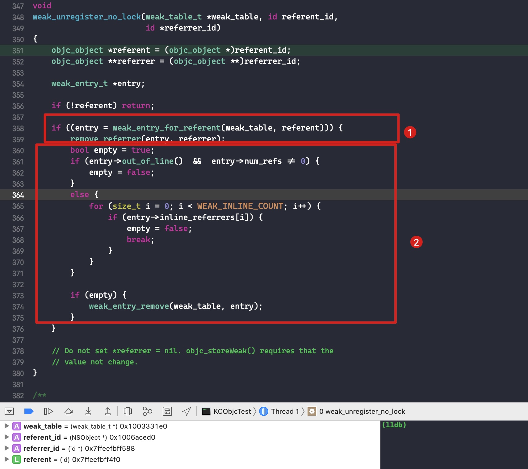 接着, 我们把断点移动到weak_register_no_lock()函数里面, 同样, 我把它分成几部分来讲解.