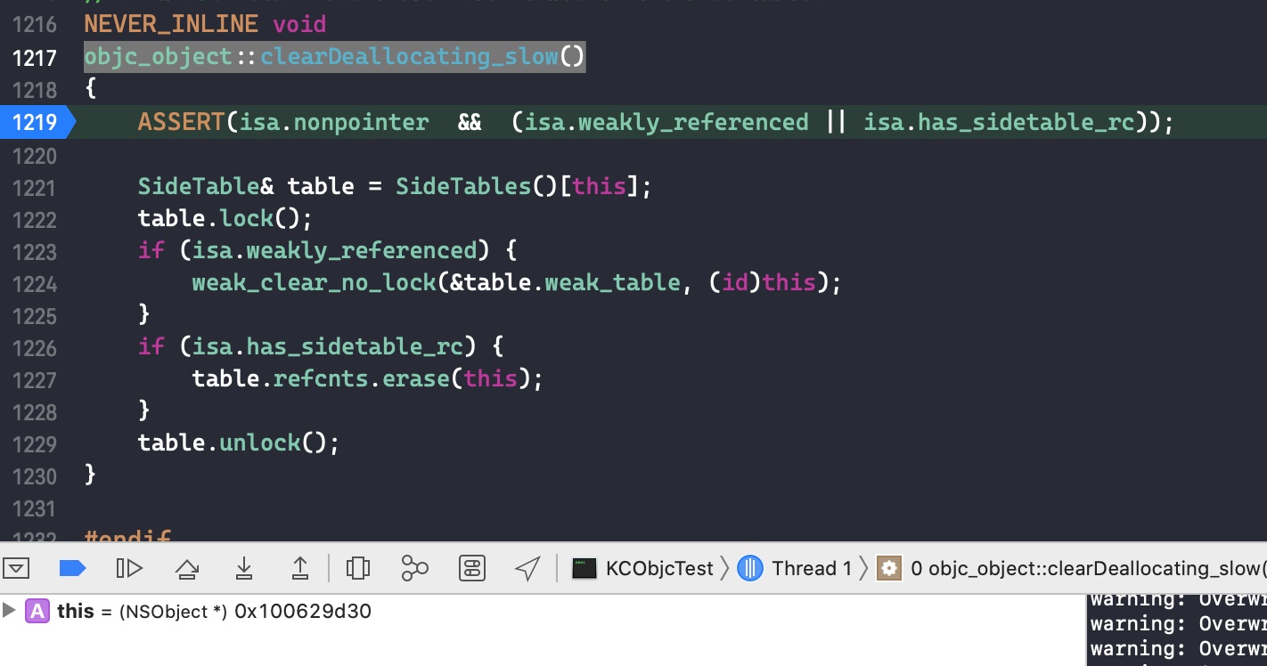 随后一直跳转到objc_object::clearDeallocating_slow()函数里面. 这个函数的作用是清除该对象在SideTable中存在于引用计数表或者弱引用表中的数据